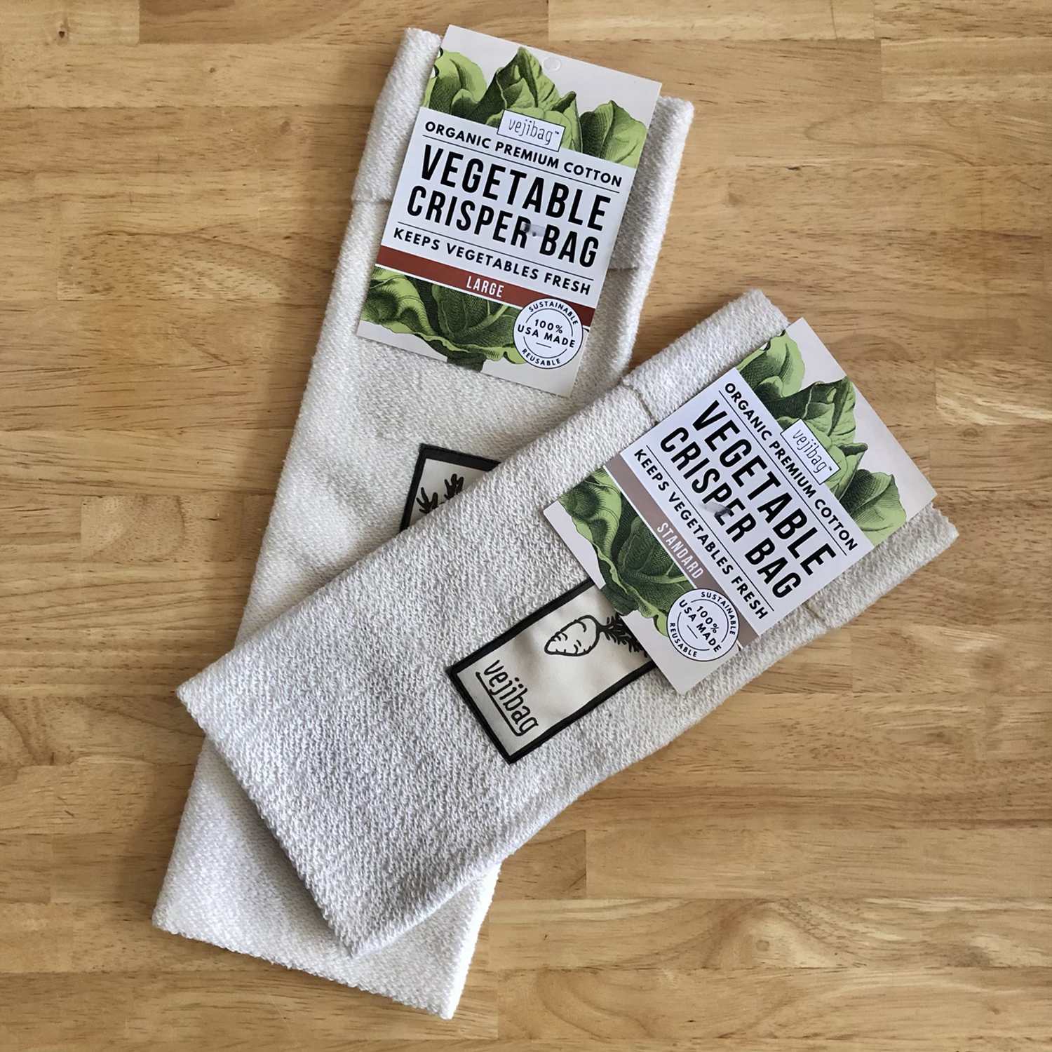 Vejibag is the healthy, eco-friendly alternative to plastic, for storing and preserving vegetables in the refrigerator. Stow all kinds of moisture-loving lettuces, greens, carrots, celery and more - to keep fresh and crisp for up to two weeks! They're 100% US made from pure, non-toxic, un-dyed organic cotton in a French terry knit weave which is the secret of their success. Moisten the cloth bag and ring out any excess moisture. This allows the thick, but open weave to keep your veggies moist while allowing them to breathe!