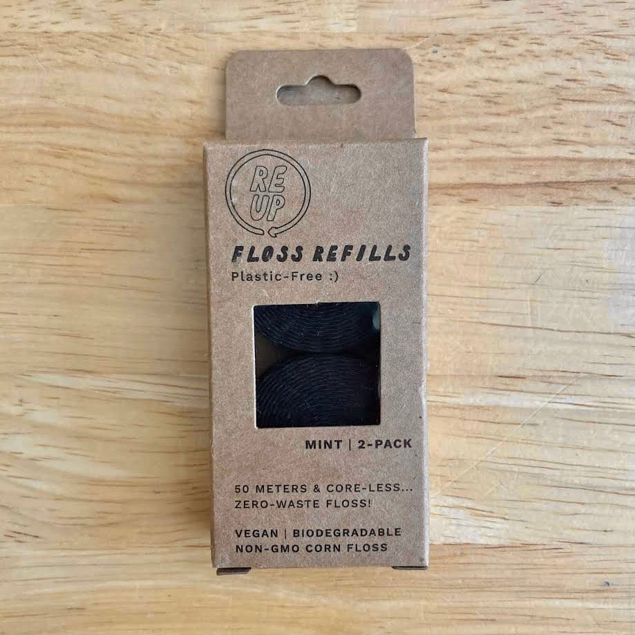 Re-Up your Floss & Spool. Re-Up's biodegradable floss spools are core-less (less waste!), 50 meters long, vegan, and come in compostable packaging. Refills come two to a pack.